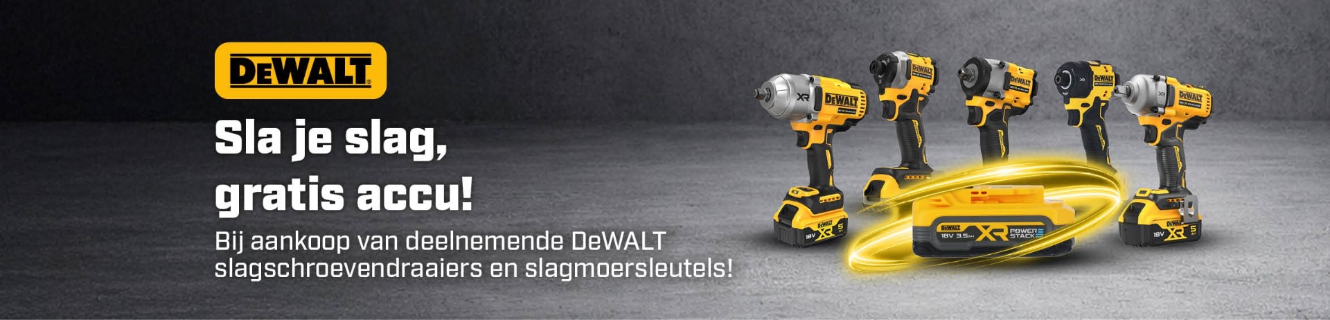 *Ontvang een gratis DeWALT 18V XR 3.5Ah accu (DCBP318-XJ) bij aankoop van geselecteerde DeWALT slagschroevendraaiers en slagmoersleutels. Deelnemende machines zijn herkenbaar aan het productlabel, de volledige lijst vindt u hier ook terug.