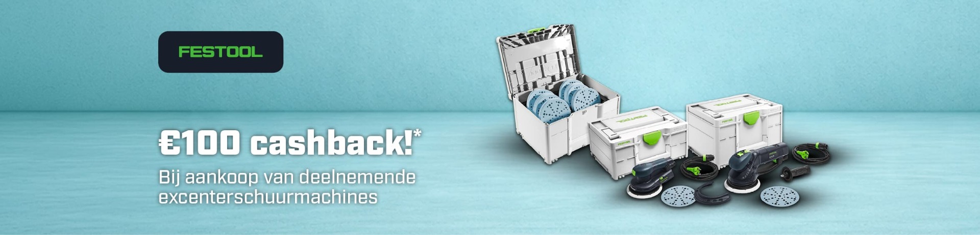 *Koop een deelnemende Festool excenterschuurmachine (herkenbaar aan het productlabel) en ontvang €100 cashback na registratie op de Festool-website. Na een succesvolle registratie wordt het bedrag binnen 6 weken door Festool op uw rekening gestort.