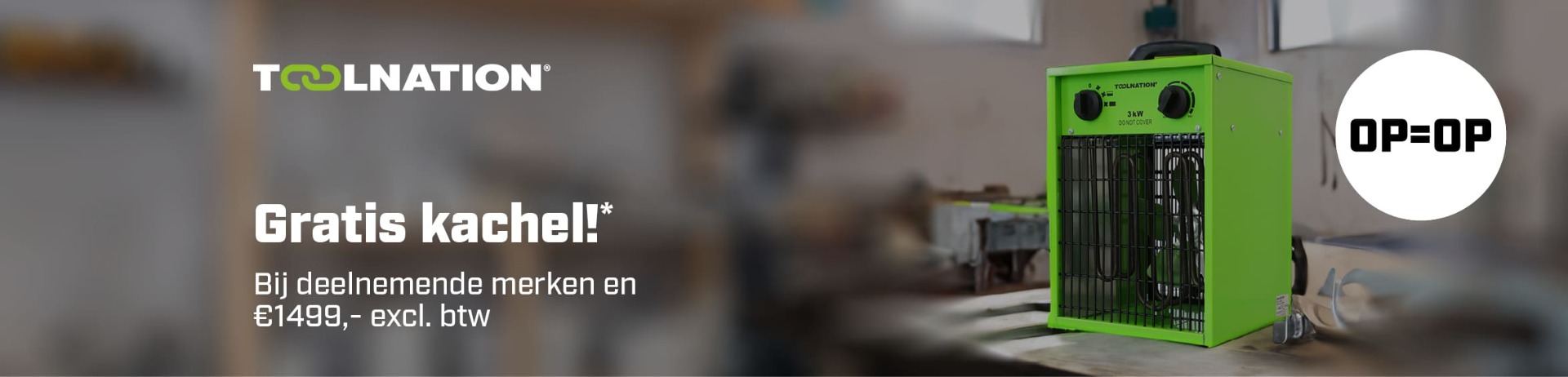 *Leg voor minimaal €1499 excl. btw. aan gereedschap en/of accessoires van de onderstaande deelnemende merken in je winkelwagen en de gratis Toolnation kachel wordt automatisch toegevoegd. Combineren mag!