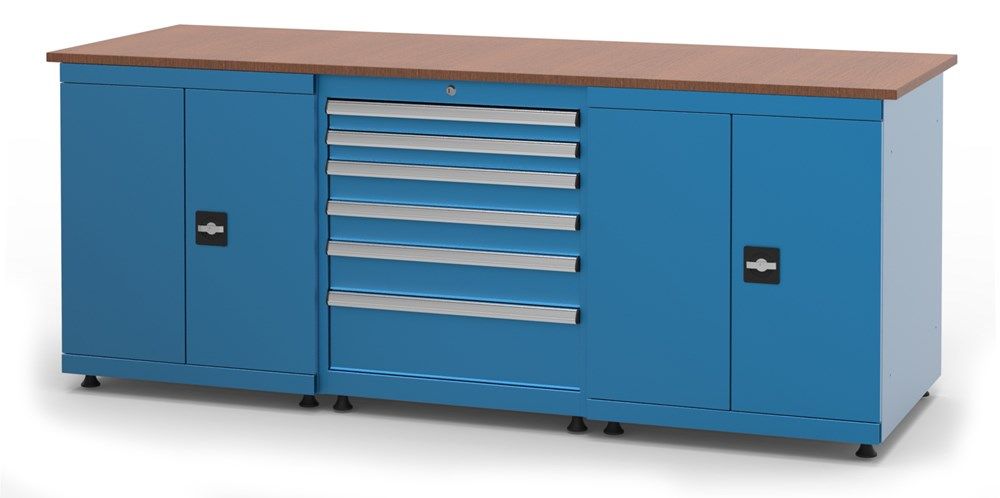 - Complete werkbank met 3 compartimenten met 1 ladenkast, 2 afsluitbare onderkast, gaatjesboard met afsluitbare deuren en gedeelte voor het opbergen van mappen met schuifdeuren