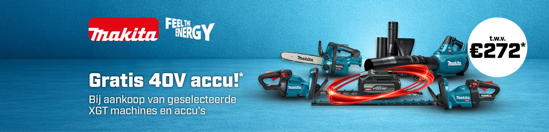 *Koop in de periode van 1 maart t/m 30 september 2026 voor minimaal €450 excl. btw aan geselecteerde Makita XGT tuinmachines, powertools, accu’s en laders of ConnectX machines, dan krijgt u de XGT BL4040F accu, na registratie, gratis opgestuurd.
