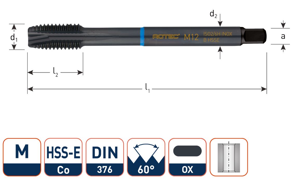- High-performance HSS-Co blauwring machinetap DIN 376, metrisch [M], 60°, ISO2 (6H), dunne schacht, type B met schilaansnijding