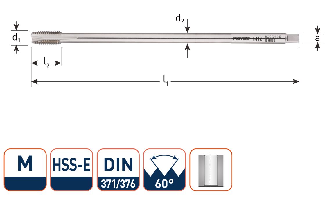 - HSS-E machinetap DIN 371-EL (t/m M6) en DIN 376-EL (M8 en groter), metrisch [M], 60°, extra lange uitvoering, type B met korte aansnijding