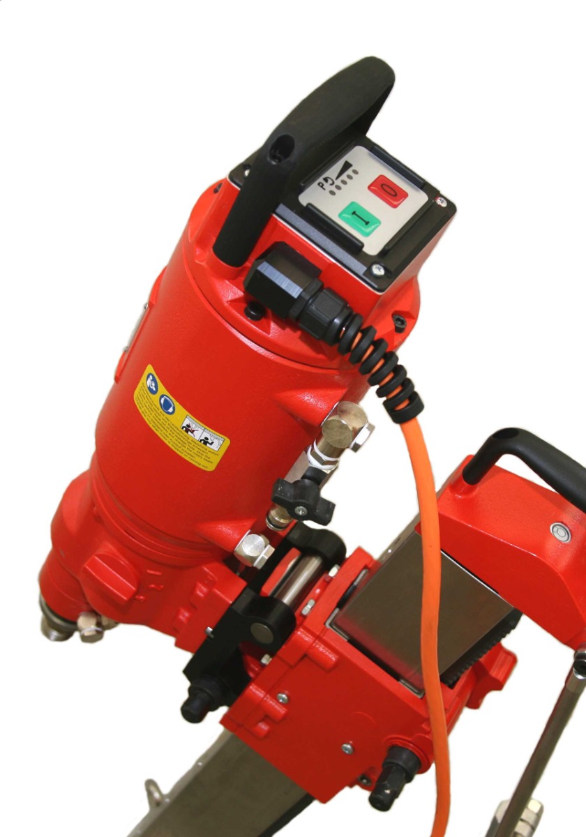 - Krachtige watergekoelde 400V diamanboormachine met 5200W, robuust ontwerp dankzij solide metalen behuizing, 3 versnellingen tandwielkast met oliebadsmering, overbelastingskoppeling en oliepomp.